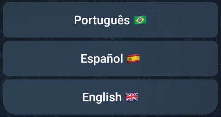 Para começar a interagir com o bot no Telegram, digite o comando /start. Em seguida, selecione um dos idiomas disponíveis: Português, Inglês ou Espanhol. Isso garantirá uma experiência personalizada e mais fluida durante o uso.