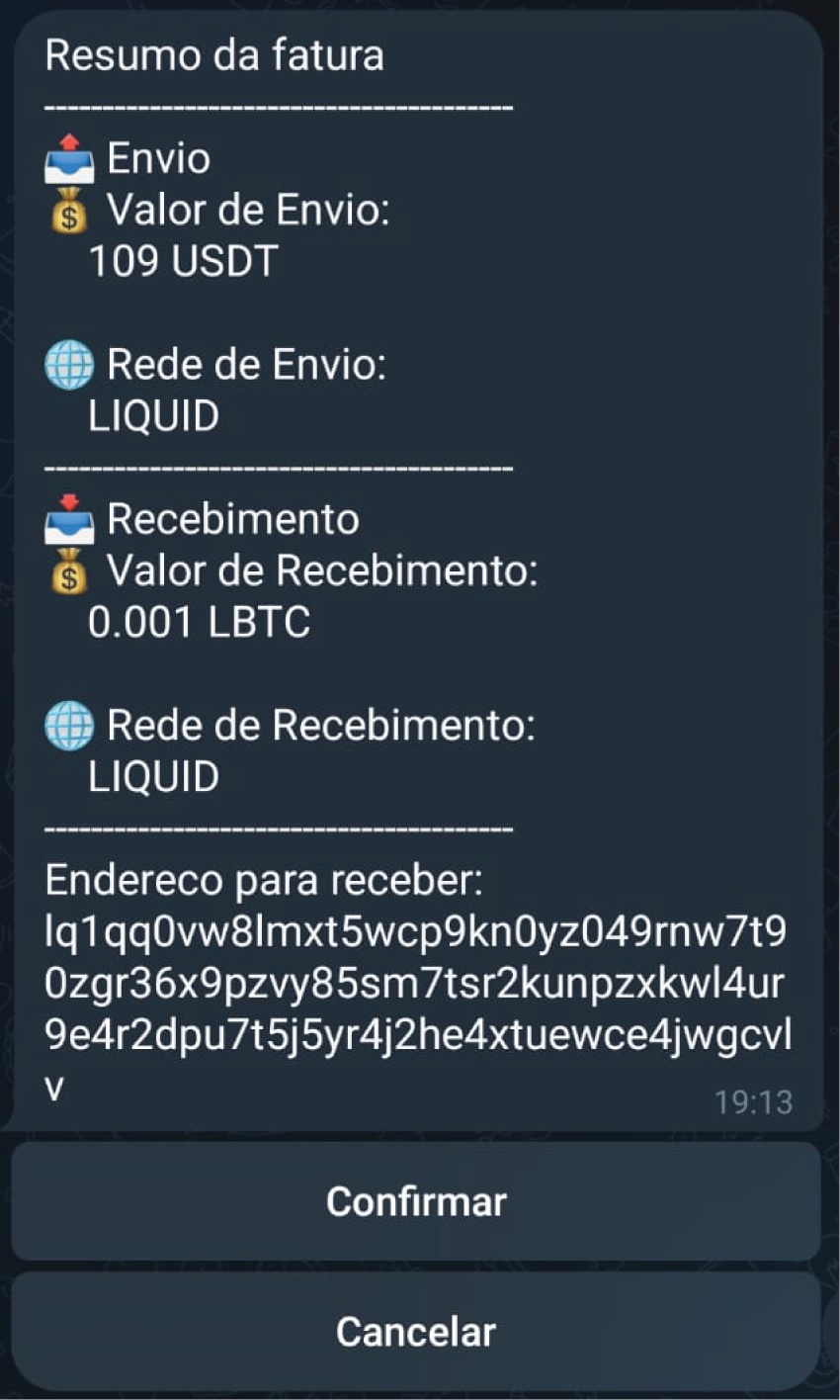 Revise atentamente todas as informações da fatura, incluindo o token, rede, valor e endereço da carteira. Certifique-se de que tudo está correto antes de pressionar o botão "Confirmar" para concluir a transação com segurança.