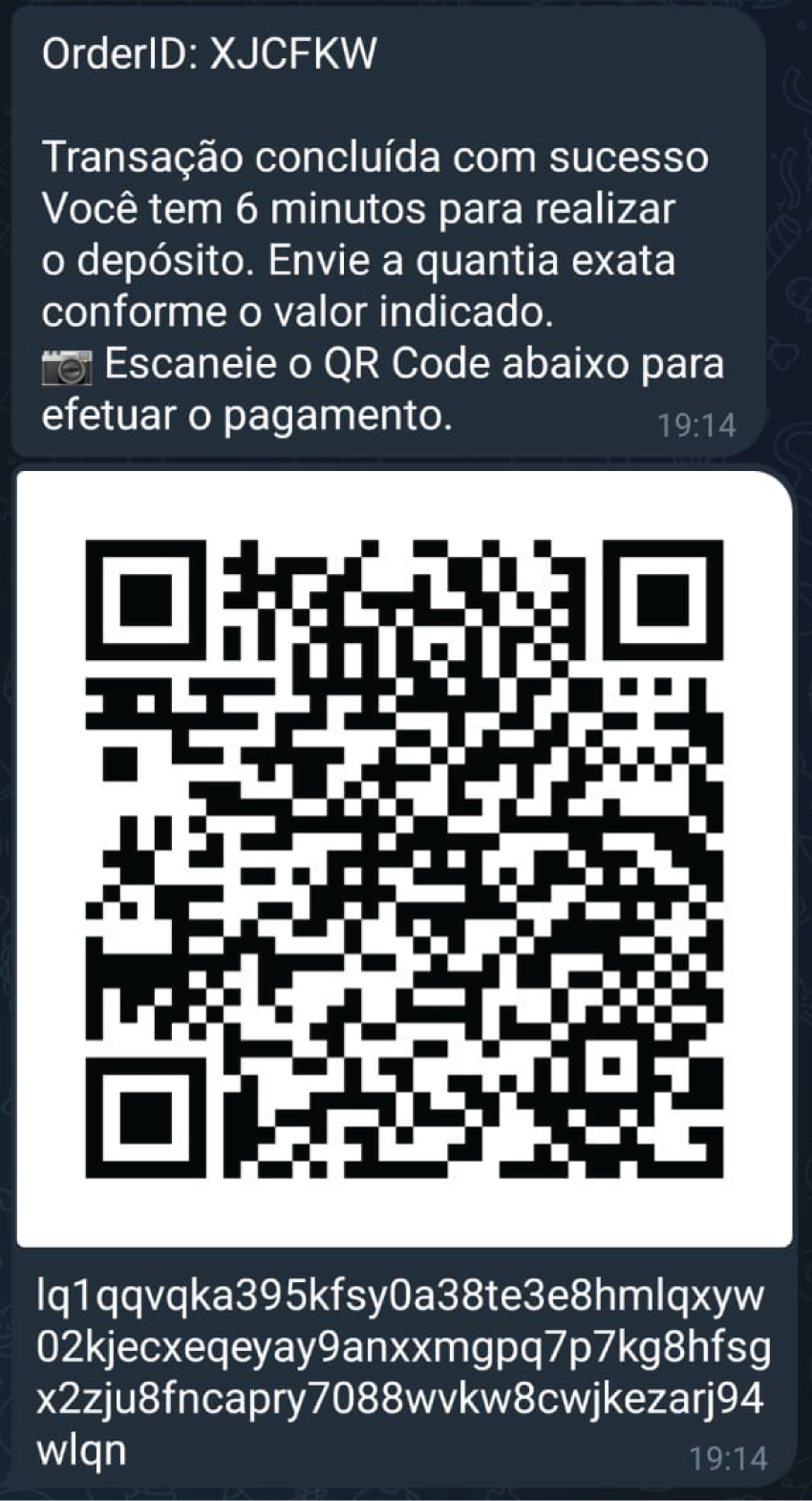 O invoice foi criado! Fique atento ao Order ID, que será seu identificador caso precise de suporte. O pagamento deve ser feito no endereço do QR Code gerado, utilizando o valor exato. Lembre-se de que o invoice expira em 6 minutos.